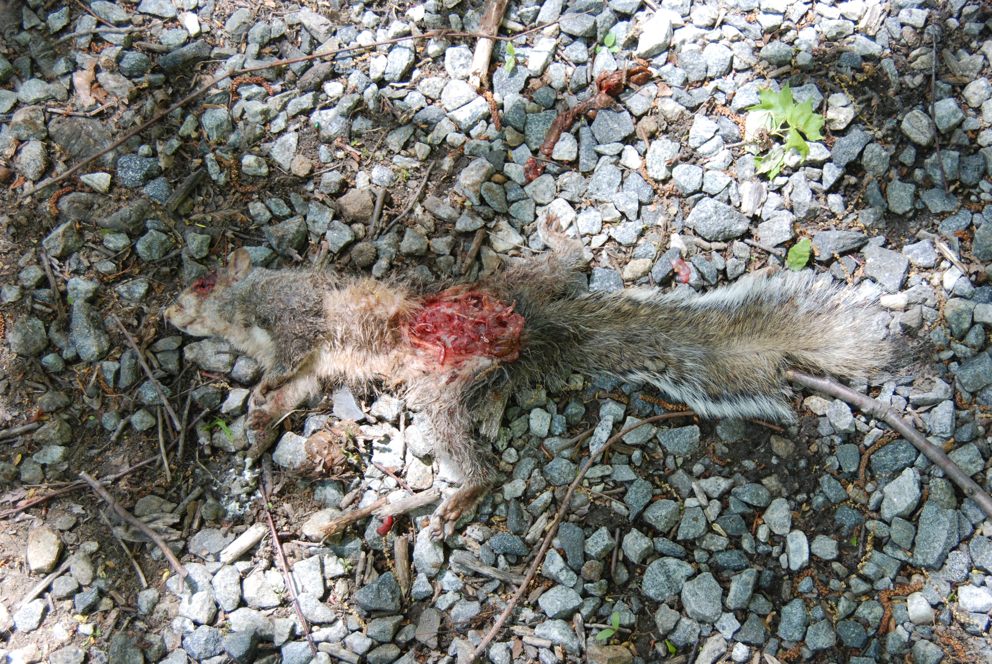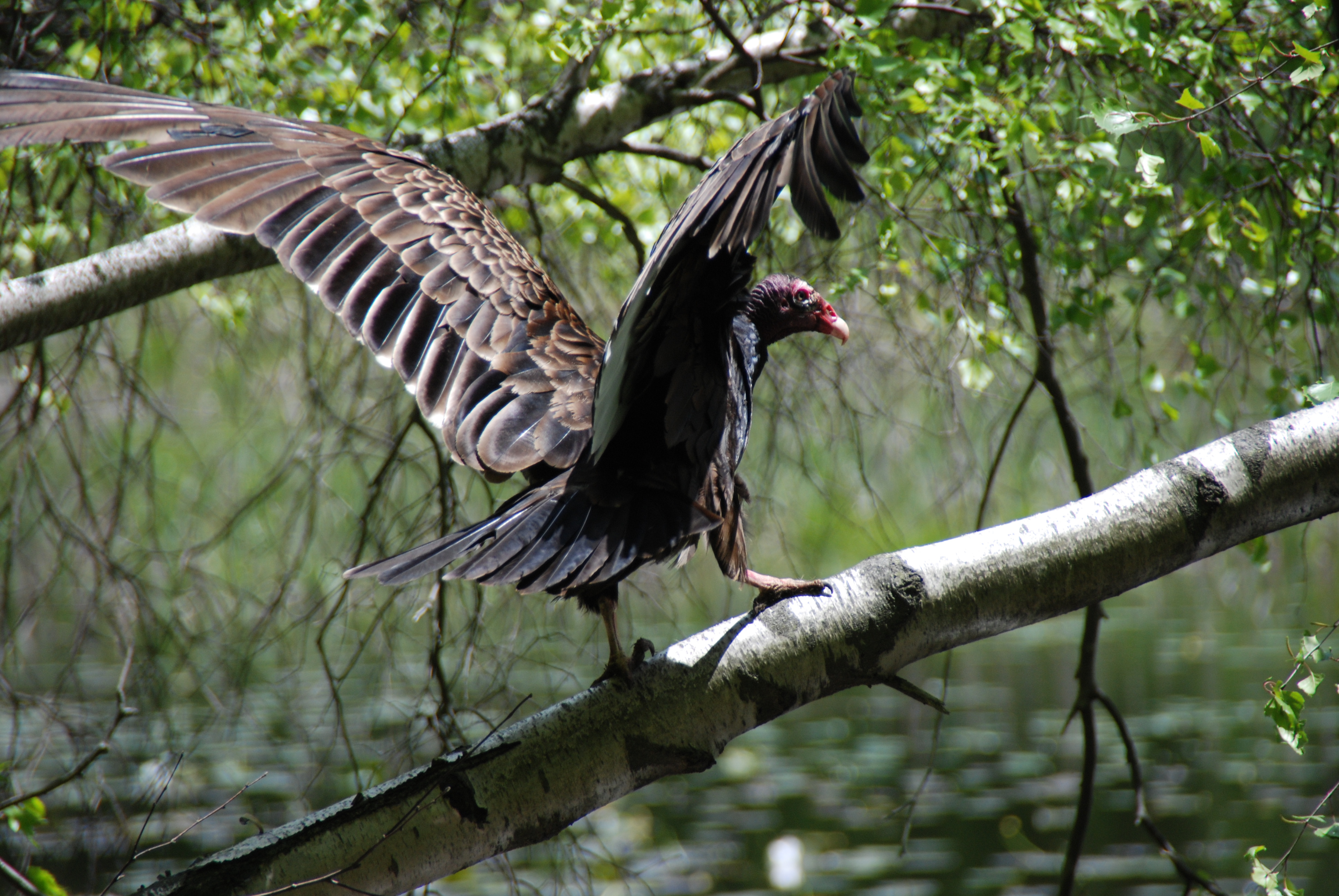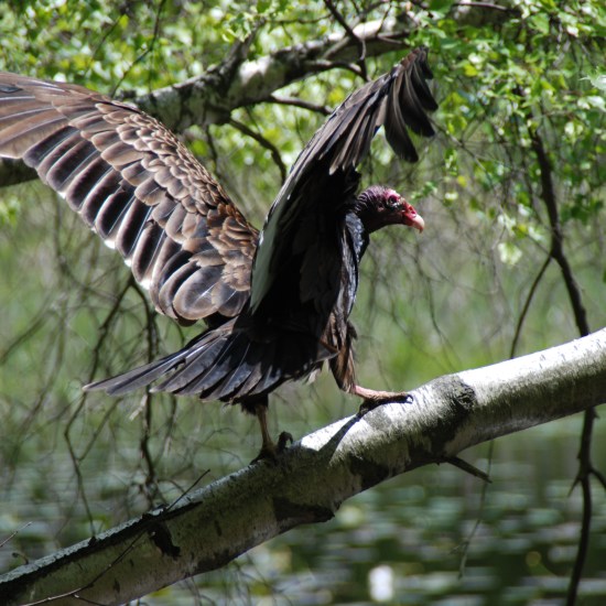 Beginning a walk into the woods I came across a vulture hovering over a squirrel. The vulture popped up onto a nearby branch as we walked through but soon returned to cleaning up our road kill.