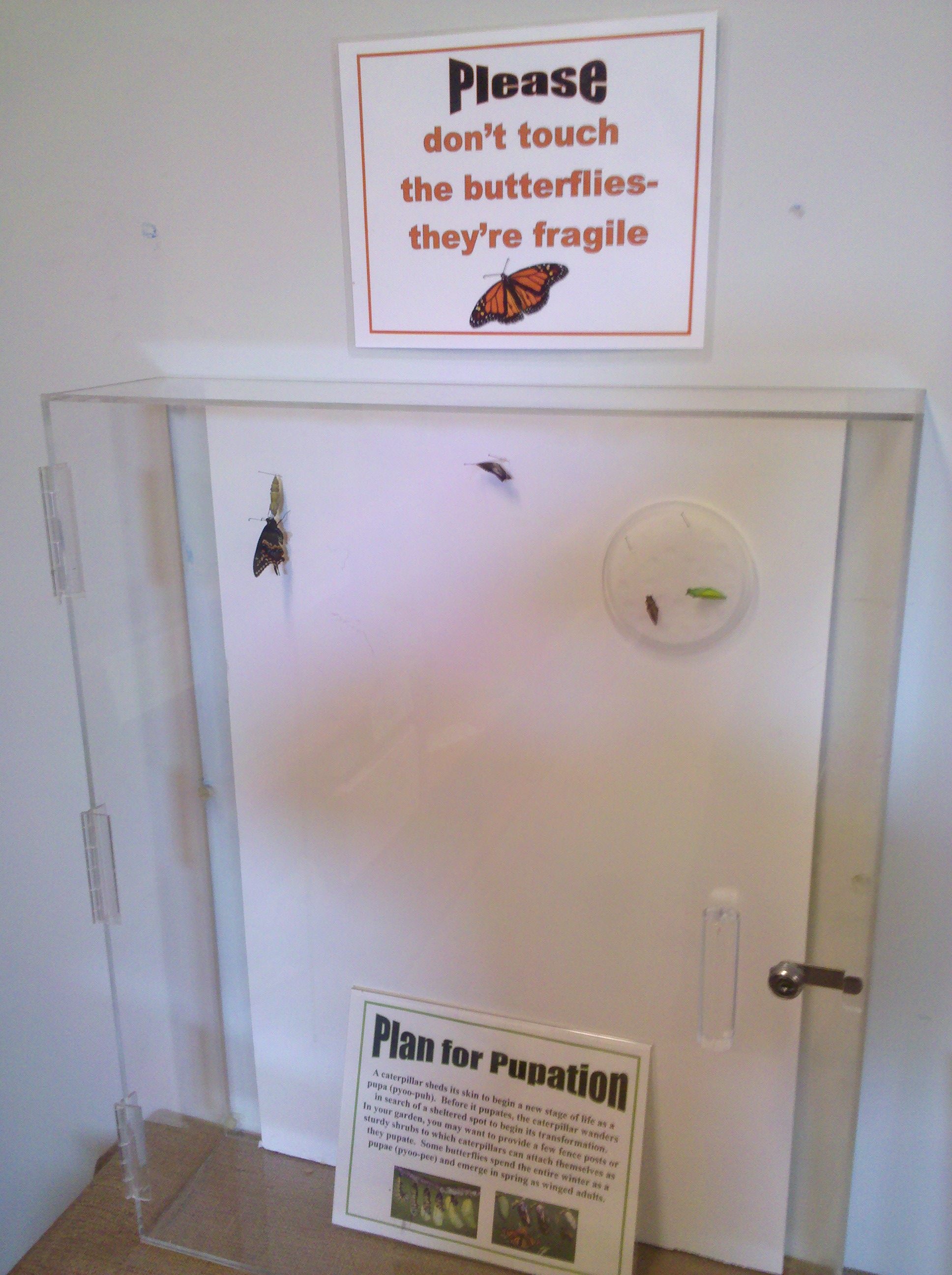 plexi case with foam board in the back used as a pupation chamber. Black Swallowtail and Varigated Fritillary chrysalis hanging.