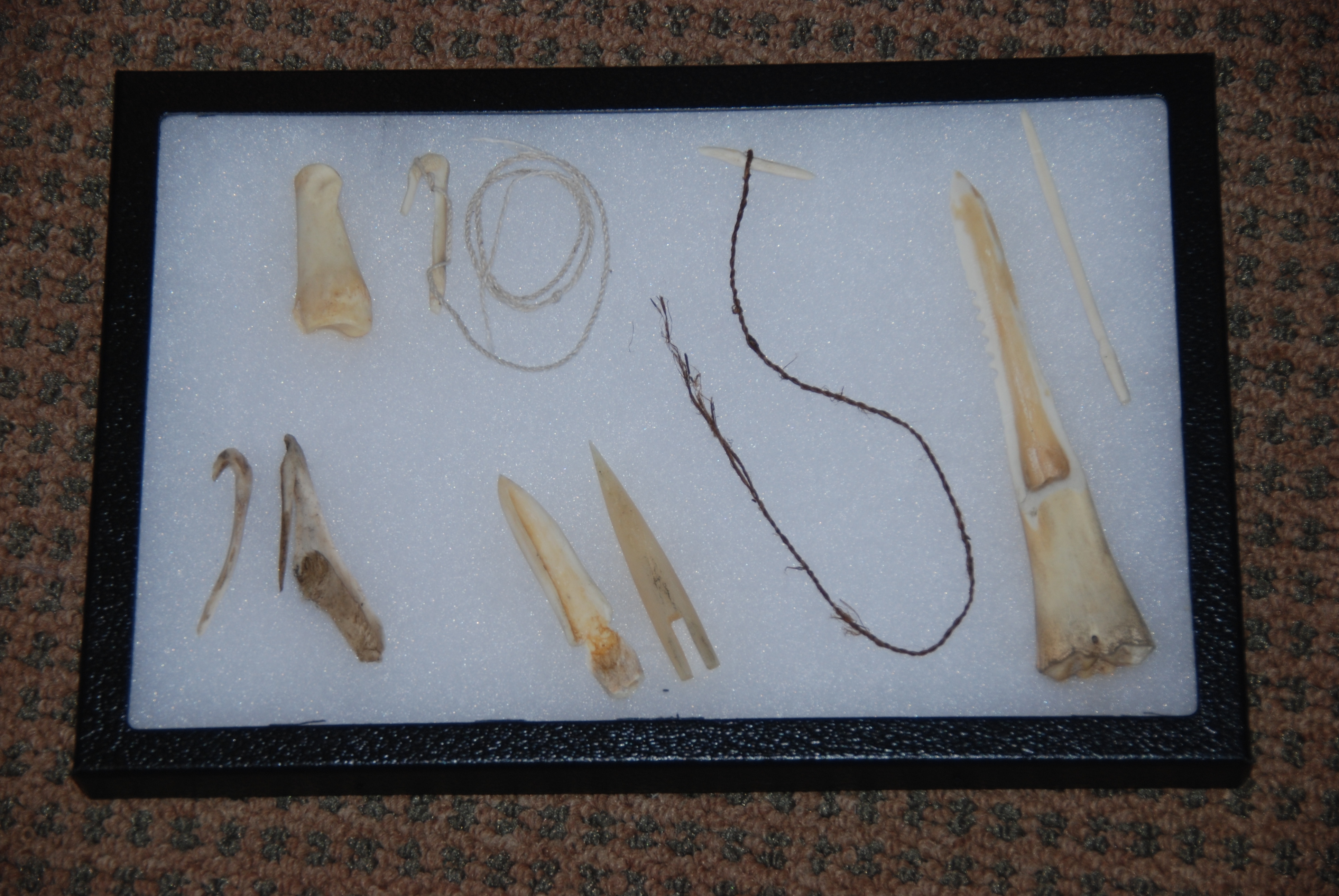Clockwise from top left: Deer Toe Bone abraded into a fishing hook, gauge hook from bone fragment, deer leg bone knife, deer nasal bone fish hook, two bone arrow point varieties.