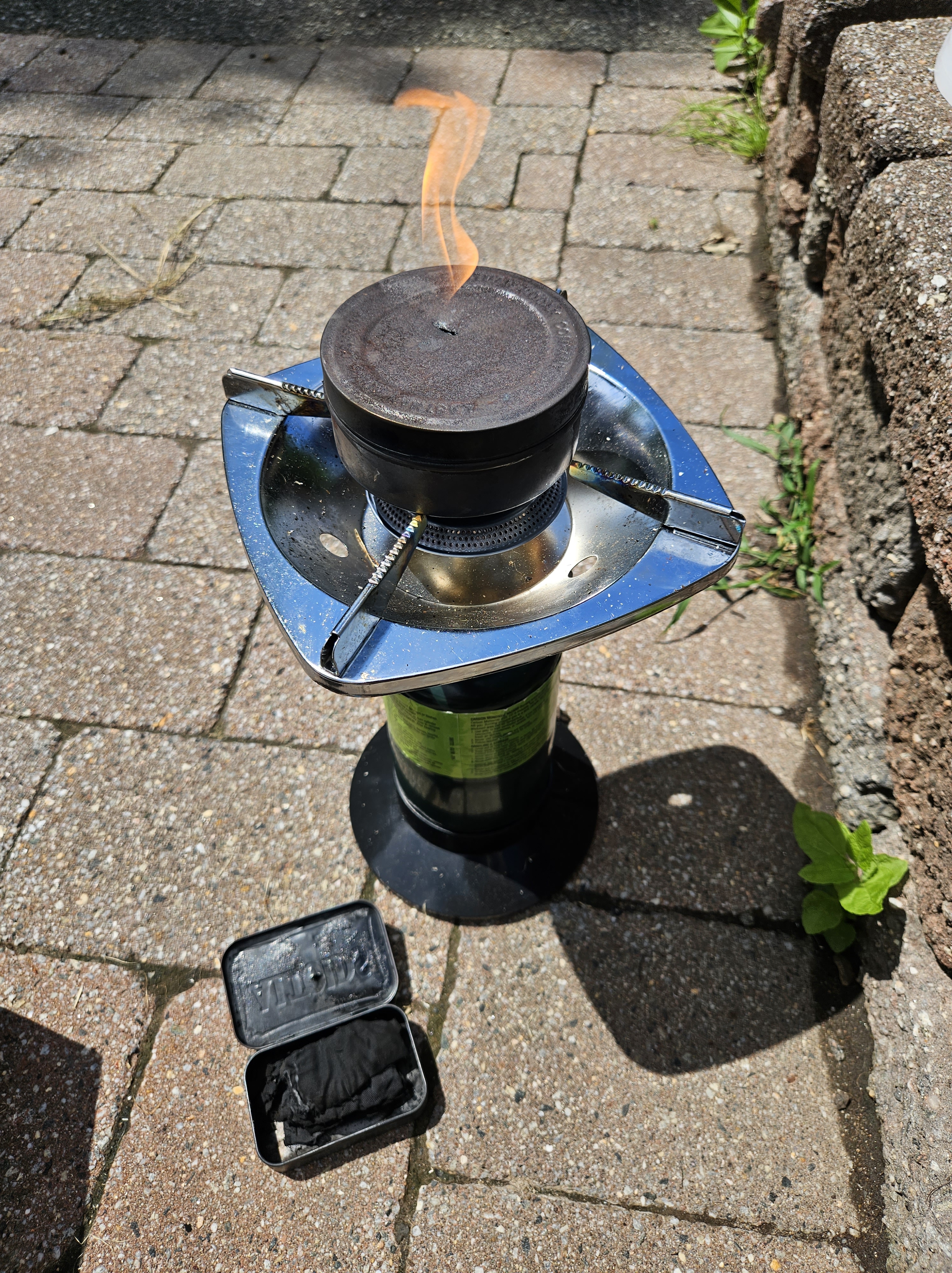- Place the container into a bed of coals from your campfire or a camp stove.