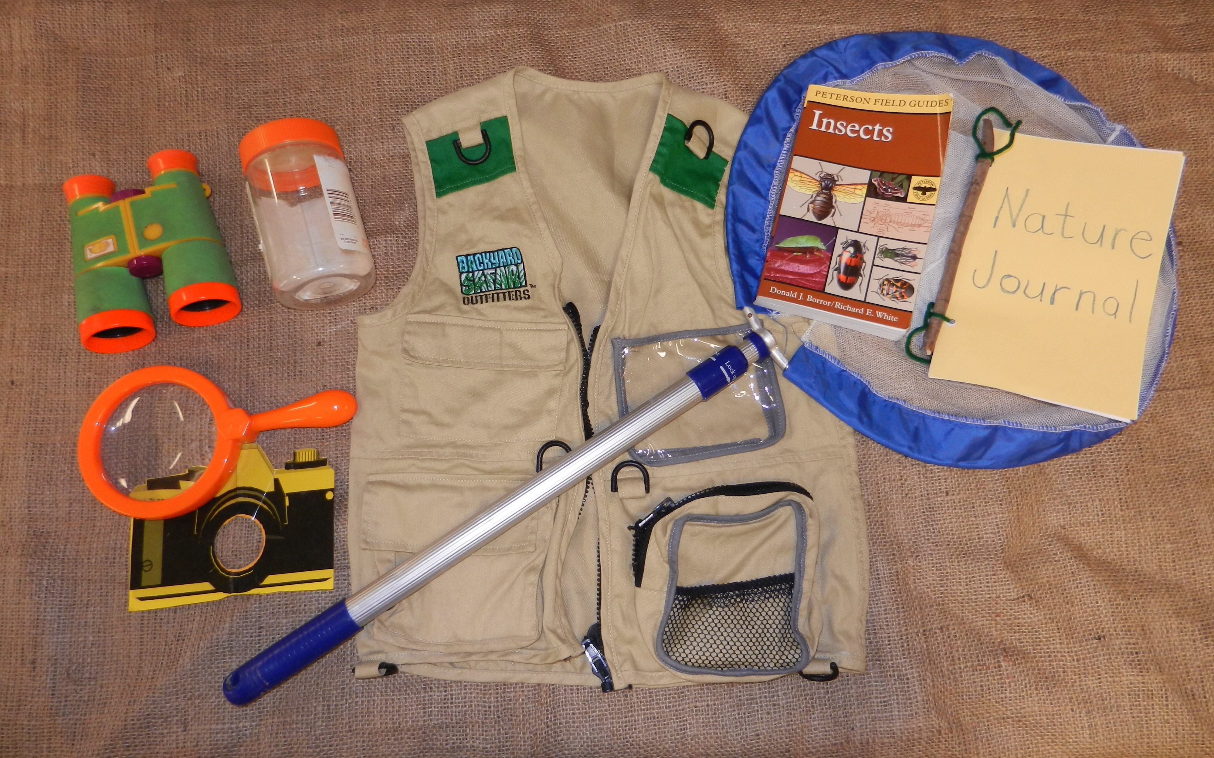 If you’re using the Buzz Into Action Curriculum, playing Entomologist Dress-Up will help add excitement to a lesson or unit on insects. Invite one student to the front of the room and start them off with a vest. I like the vest from Backyard Safari sold at Toys R Us because of all the pockets. Ask the students “what other tools should an entomologist use to study insects?”. Include a magnifying glass, binoculars, camera, note pad, pencil, collection jar (use a clean peanut butter jar and remember to collect, observe, identify and release), net and most importantly a field guide. Many students have never seen a field guide and should be exposed to these science starters. Many a budding biologist poured through the pages of field guides (often golden guides) as a child. Students may also add water, snack, compass, gps and other accouterments.