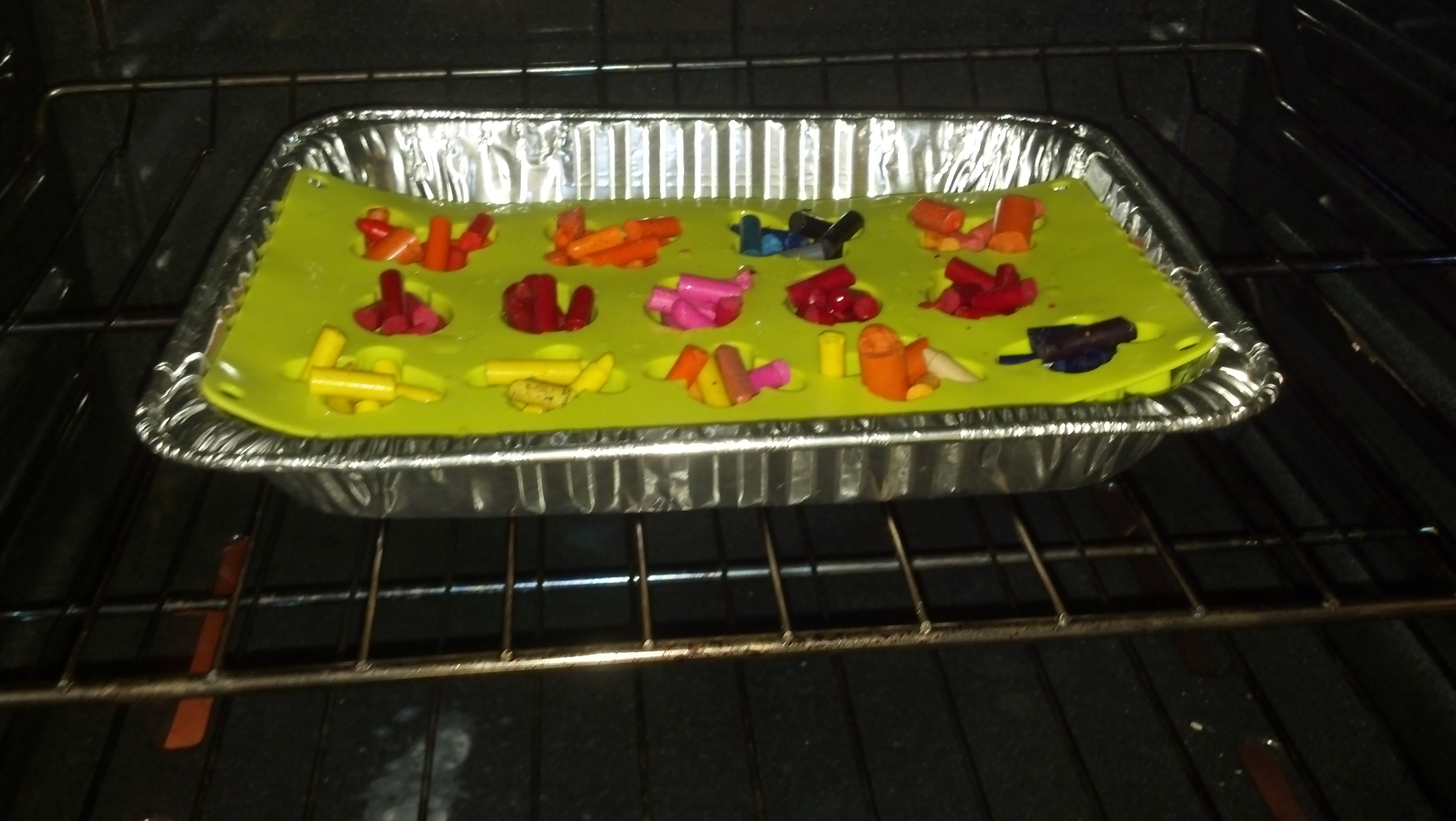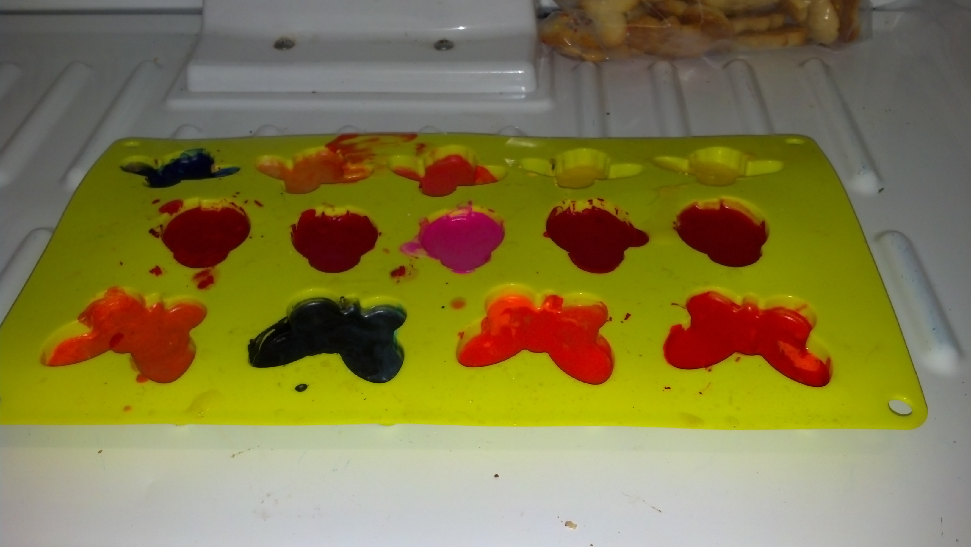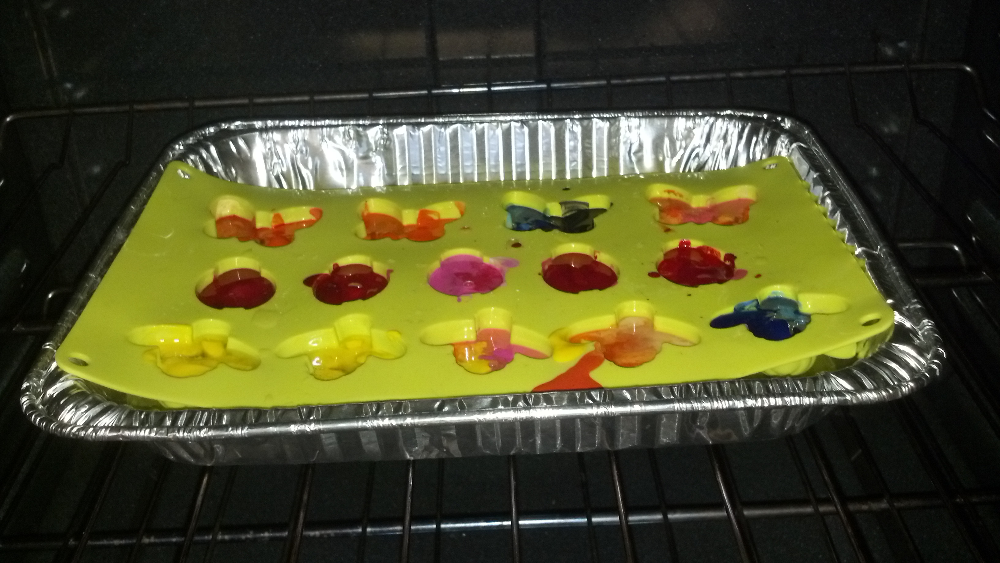 Any elementary educator is sure to amass a collection of bits and pieces of crayons overtime. With a muffin tin you can easily melt and recycle crayons into shapes of your interest, in my case butterflies, ladybugs and bees. I’ll most likely use them for little gifts, prizes, recycling programs and bug birthday parties or as a fundraiser. To make them you or your students can place them in a solar oven, leave them to melt in the sun (I place them in a gardening coldframe) or pre-heat your kitchen oven to 225F. There is no need to coat the molds in oil as the crayons pop out easily when hardened. After about 30 minutes in the solar oven, a few hours in full summer sun (especially on concrete or a hot deck) or ten minutes in a kitchen oven they are fully melted. You can place them in the freezer to speed up the hardening process or just leave them on a counter or in the shade. About ten minutes in the freezer and they pop right out or 25 minutes on the counter. Be extremely careful not to spill the liquid crayon as it hardens on contact with whatever it hits and is extremely difficult to remove (from experience).