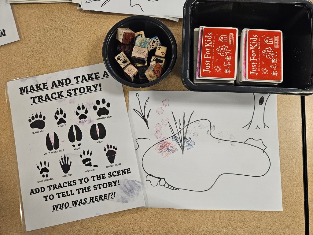 One of the activities I use with children when tracking includes helping them to recognize clear print classification or the ability to recognize a clear animal print in substrate like mud, sand, clay or snow. Using plaster outside with tracks that you find or like displayed here with air dry clay inside with replica animal tracks you can create a “Match the Track” game to quiz for nature knowledge. This is part of a Wild about Wildlife program. I like to slowly show the animal track and allow students to touch it before providing increasingly obvious clues as to the animal who made it to help all the students make the connection. The game below allows for individuals to test and expand their nature knowledge with or without an instructor available. At the end of the lesson children get to make and take their own animal track or set of tracks.