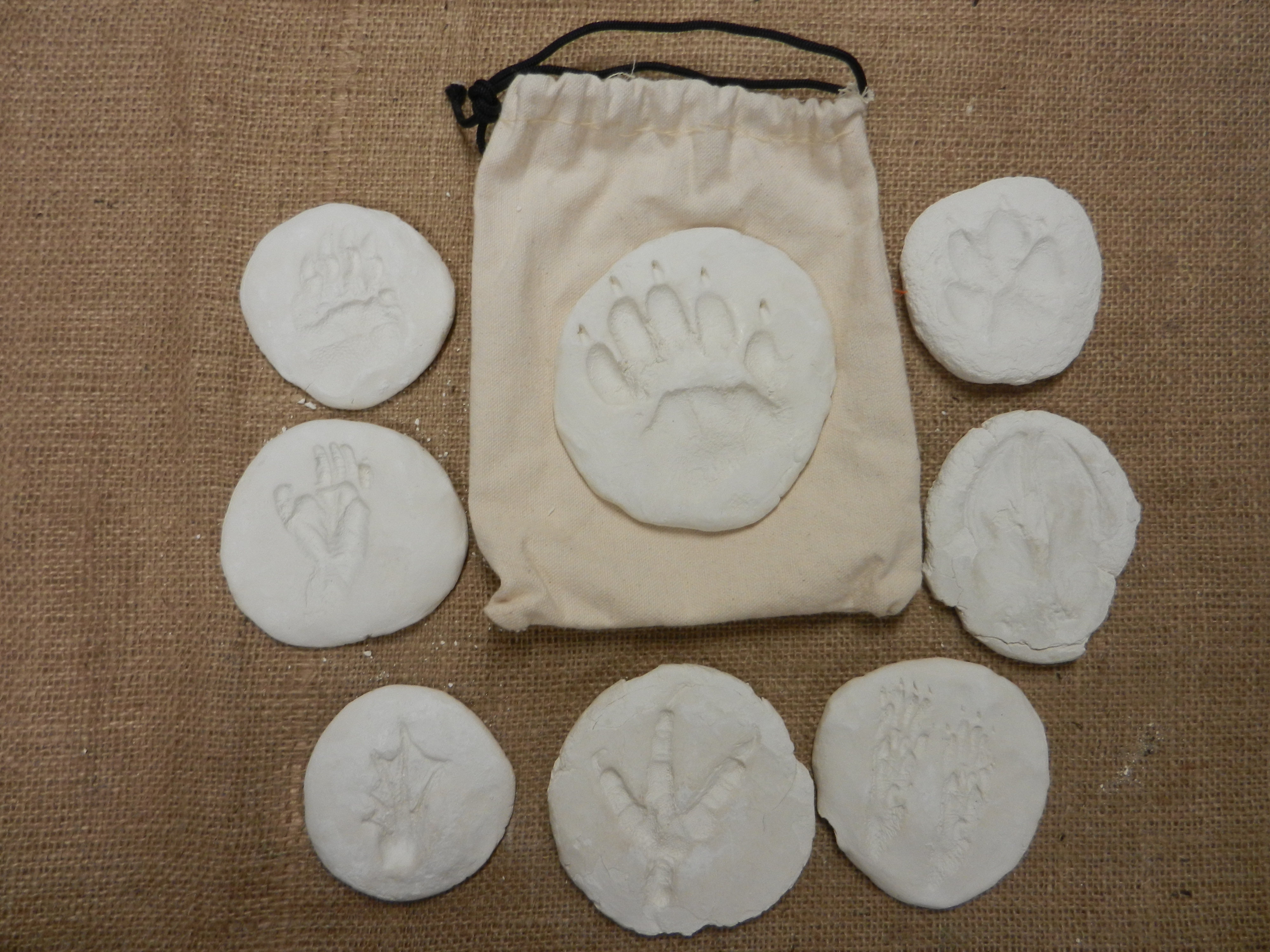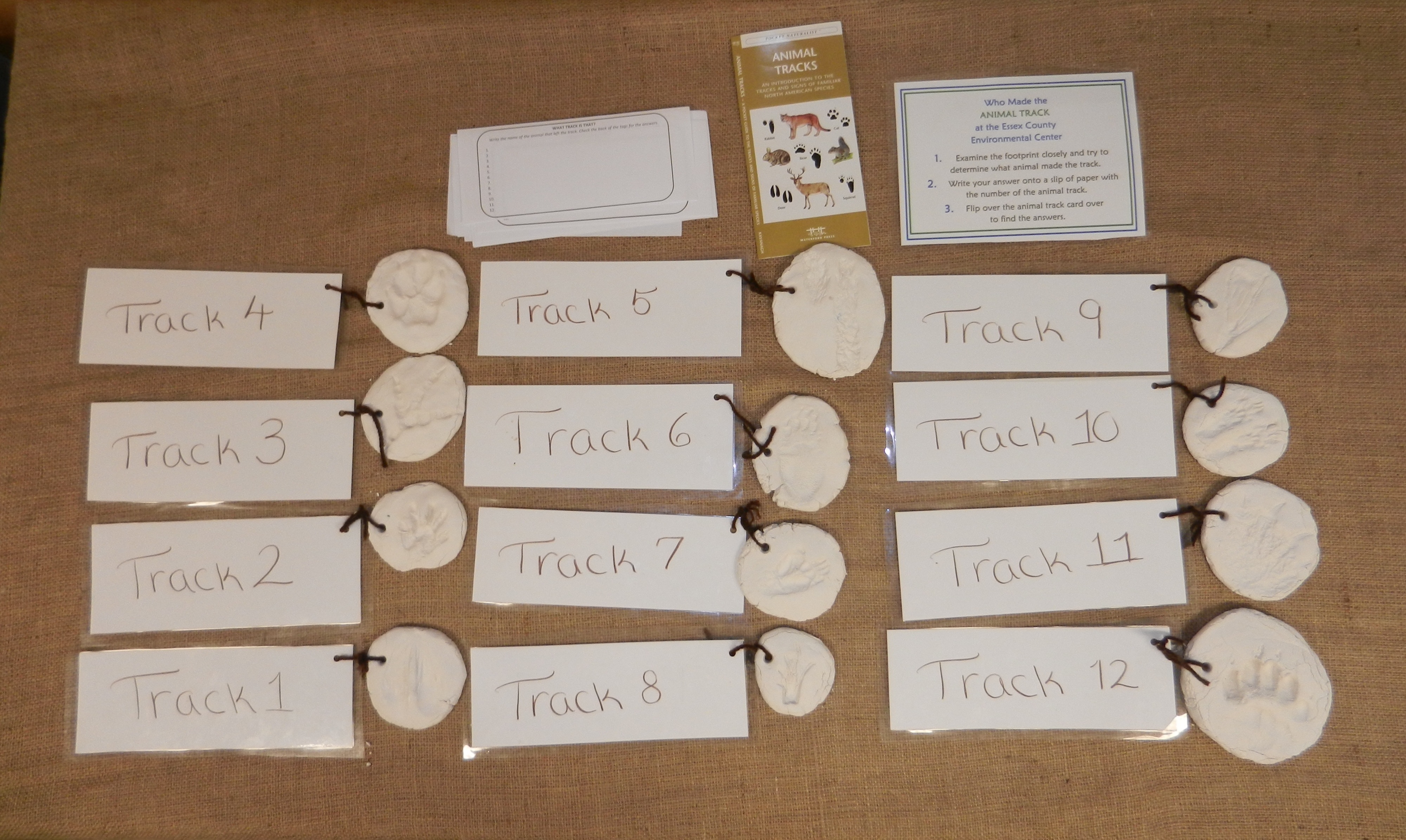 To make your own: 1. Roll a ball of air dry clay a bit bigger than a golf ball. 2. Press your open hand on the clay ball to flatten it. 3. Press the animal track into the clay. 4. Use a pencil to place a hole into the track if you want it to be worn as a necklace once it has dried solid.