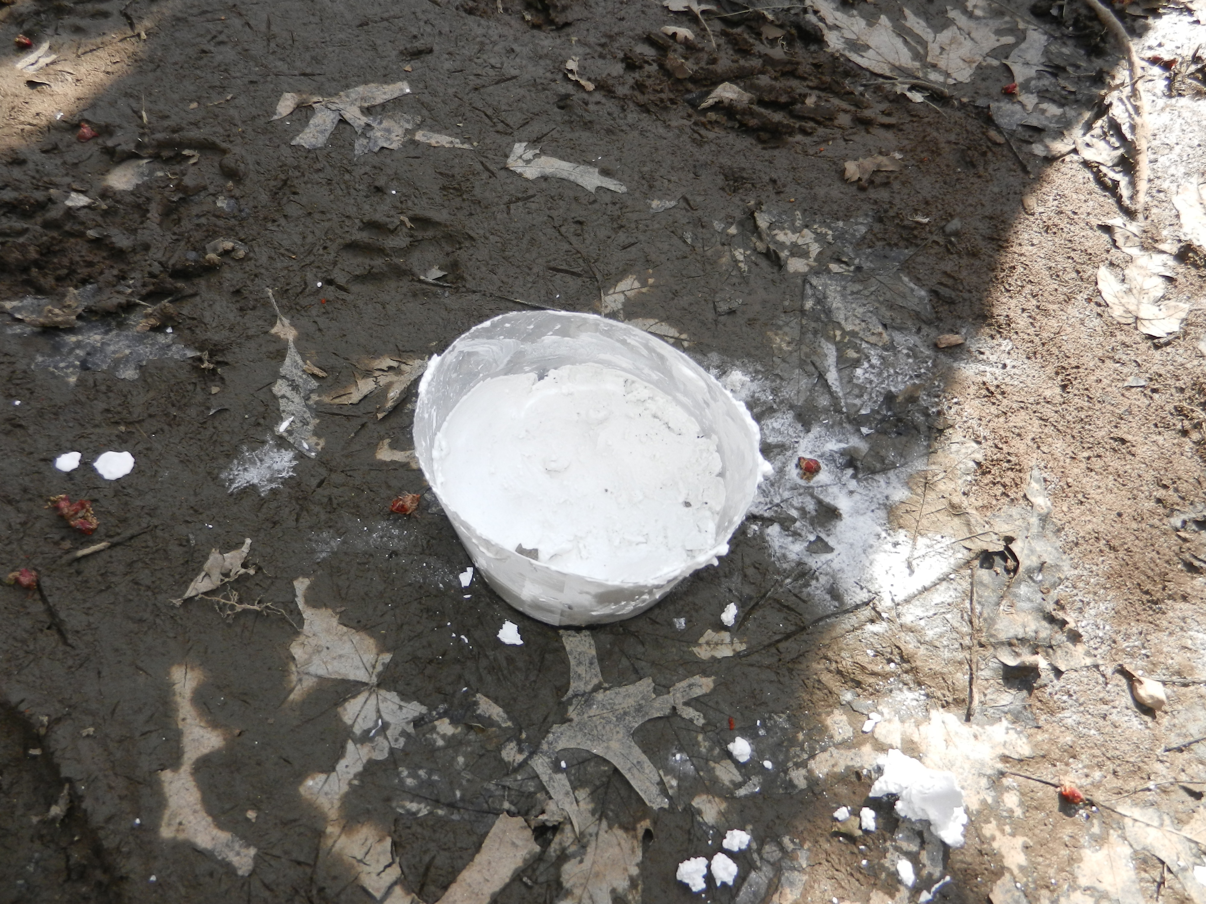 Exploring with groups of children you often find more evidence of wildlife than you actually see wildlife. They see us, hear us, smell us – all long before we make much distance into the forest. You might think of our presence as creating outward concentric rings alerting the animals to potential danger. The birds sound the alarm call, the squirrels scatter, the frogs plop down below the surface of the pond. Because of this we often act as wildlife detectives and focus on the tracks animals leave behind. You can capture the individual tracks in detail using Plaster of Paris.