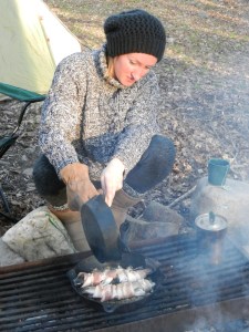 Natalia Cooking Brook Trout Wrapped in Bacon on Campfire