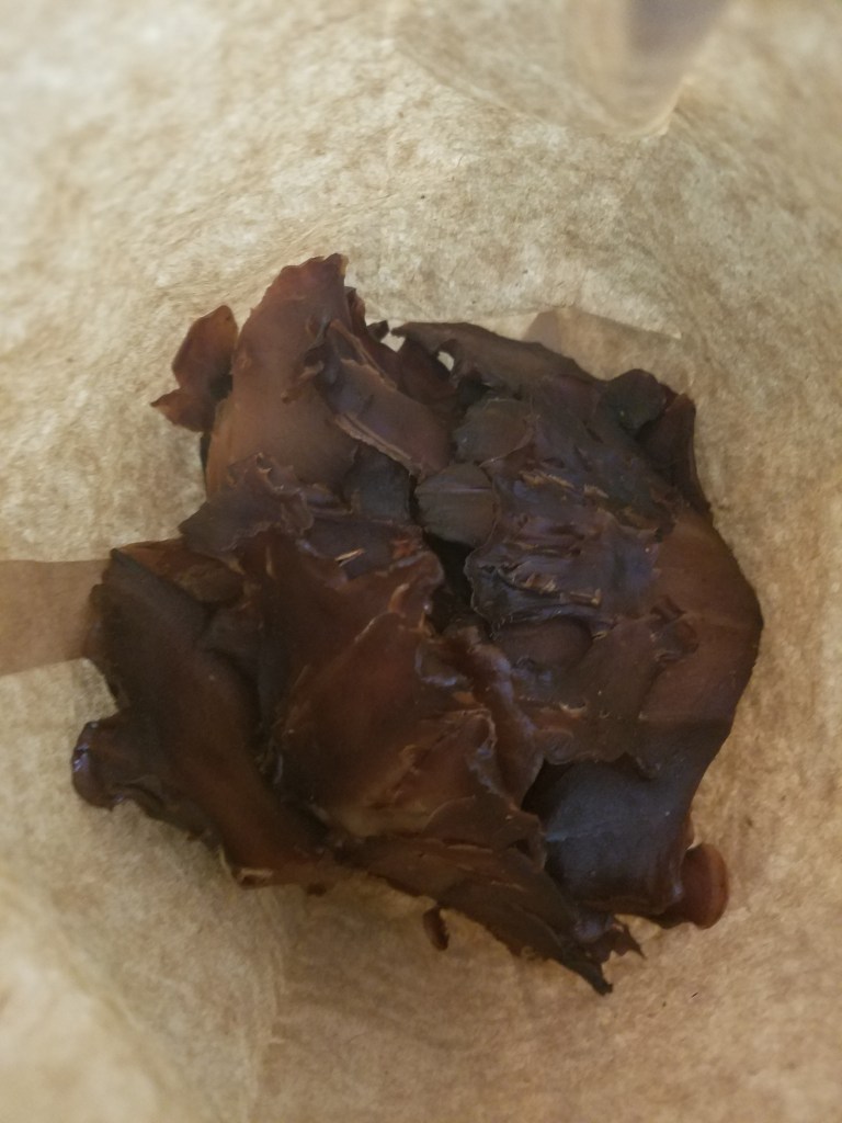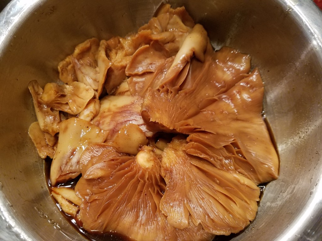 To make the mushroom jerky, I boiled pieces for 10 minutes, strained and placed them in a marinade overnight. The marinade was a mix of honey, chili powder and soy sauce. The jerky went in the dehydrator the next day at a low temperature for about 8 hours until it felt right.