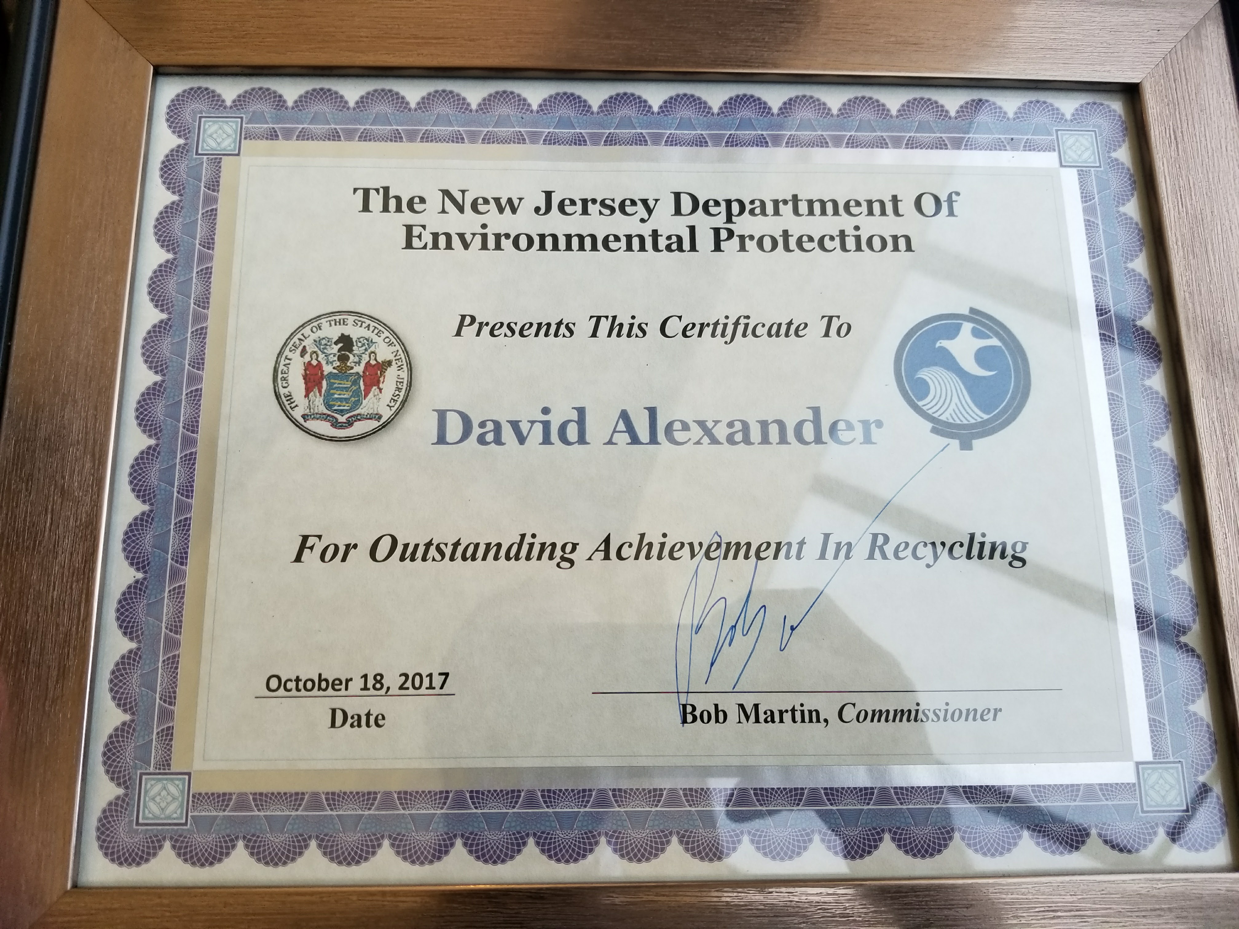 I was recently awarded an Outstanding Achievement Award from the New Jersey Department of Environmental Protection, Association of New Jersey Recyclers.