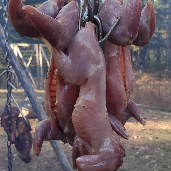The squirres skins were made into drink coozies that kept the delicious Iron Bound Hard Cider cold. Tails were collected for use in tying fishing lures by local anglers amd to send to Mepps.