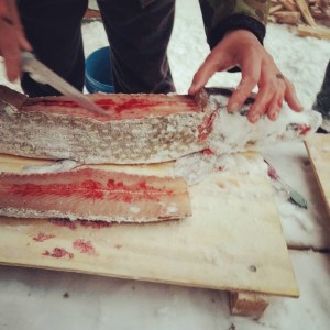 After catching one Laker that I did decide to keep, I slit the gills at the chin of the fish to let it bleed out quickly, gutted it with my belt carry blade and buried it under the snow to hide it from the crows and keep it from freezing over the next 2 days.