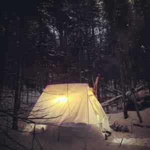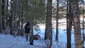 After pulling sled a distance Alex and I found an access point into the forest and pulled up away from the water. One of the Adirondack camping regulations to know and follow is “Camping is prohibited within 150 feet of any road, trail, spring, stream, pond or other body of water except at areas designated by a “camp here” disk.” There were no designated sites so we found a flat area and made camp.