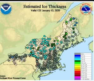 One of the first sites I’ll check is National Weather Service NERFC Snow Page to see Estimated Ice Thickness. Of course you still have to “Go to Know” and use a metal spud to hit the ice ahead of you and check for solid consistency.