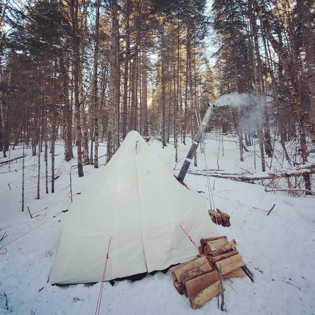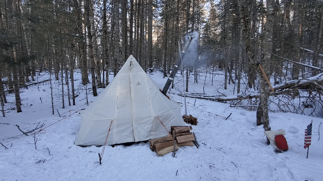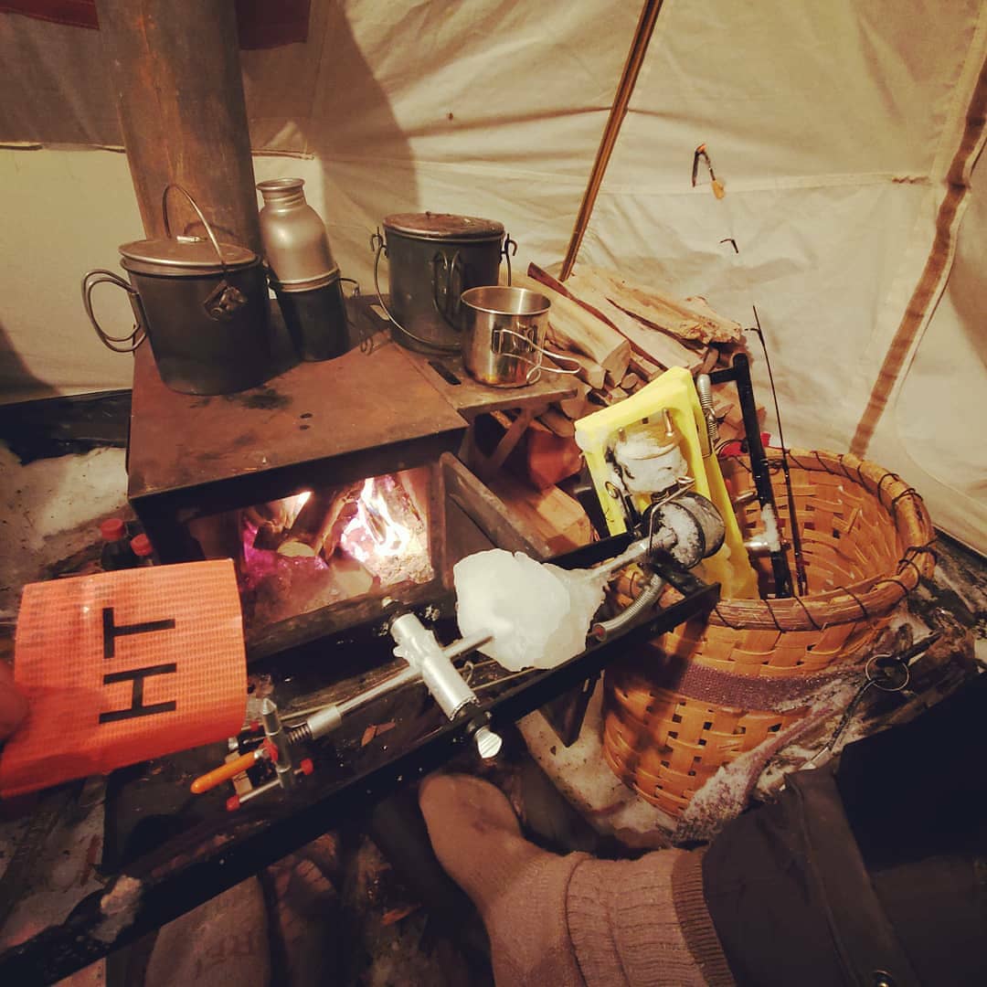 Once the tip-ups were set on the ice, I was able to finish setting up camp and get the stove operational. I’ve learned to pull in a bit of local or Stewarts store seasoned firewood just to kick things off and keep the stove happy but then go out and cut the available dead, down and dry wood. I always process too much out of concern and leave a big pile behind. Better safe than sorry..better warm than cold. One of big benefits to making your own site is the ease of finding good wood as opposed to when camping at designated sites that get picked clean.