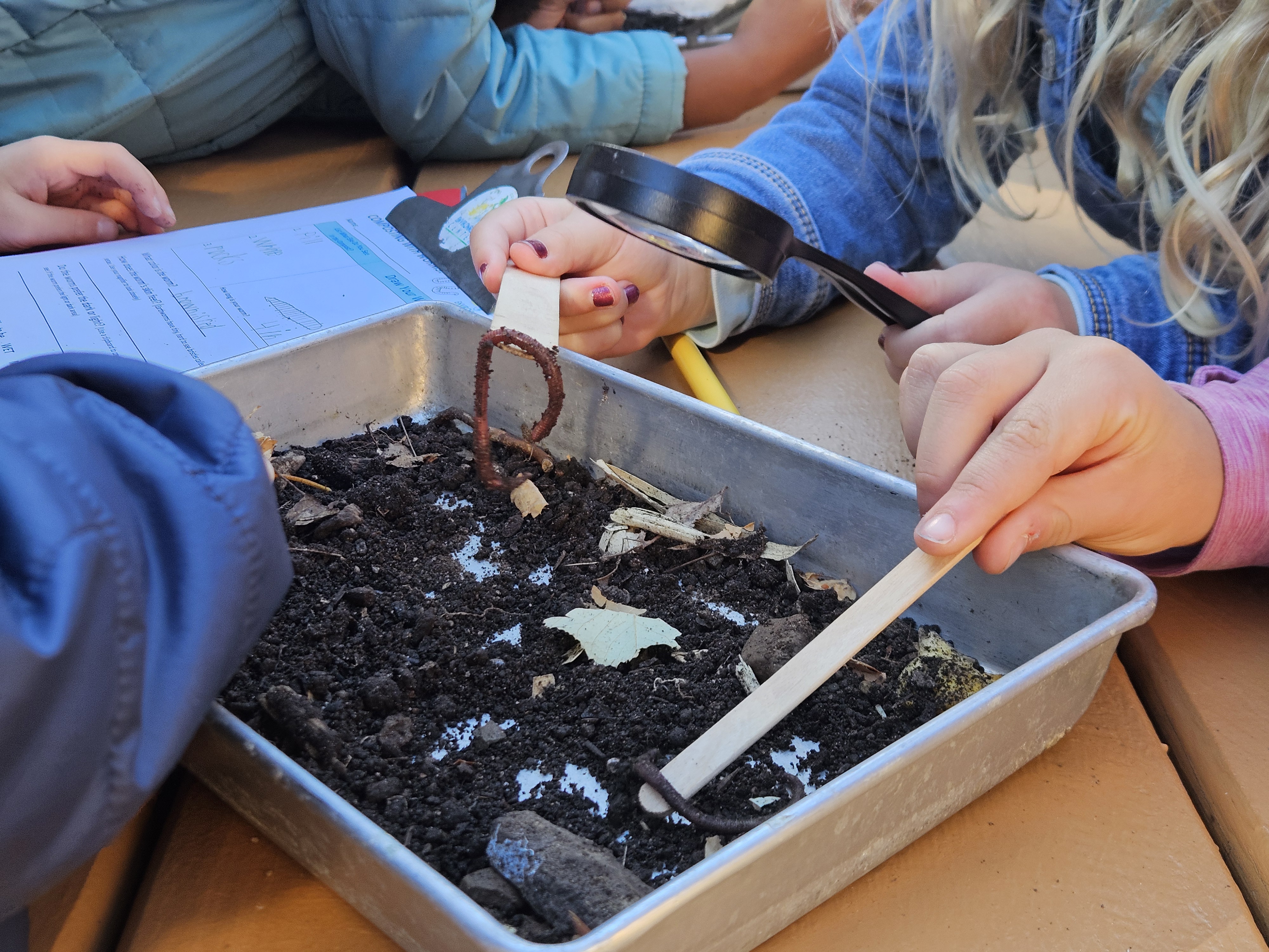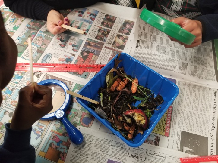 If you are teaching about compost, laying some out is a fun way to invite students to examine it like a detective to better understand what is included. Letting them explore with magnifiers and popsicle sticks is sure to be an exciting lesson!