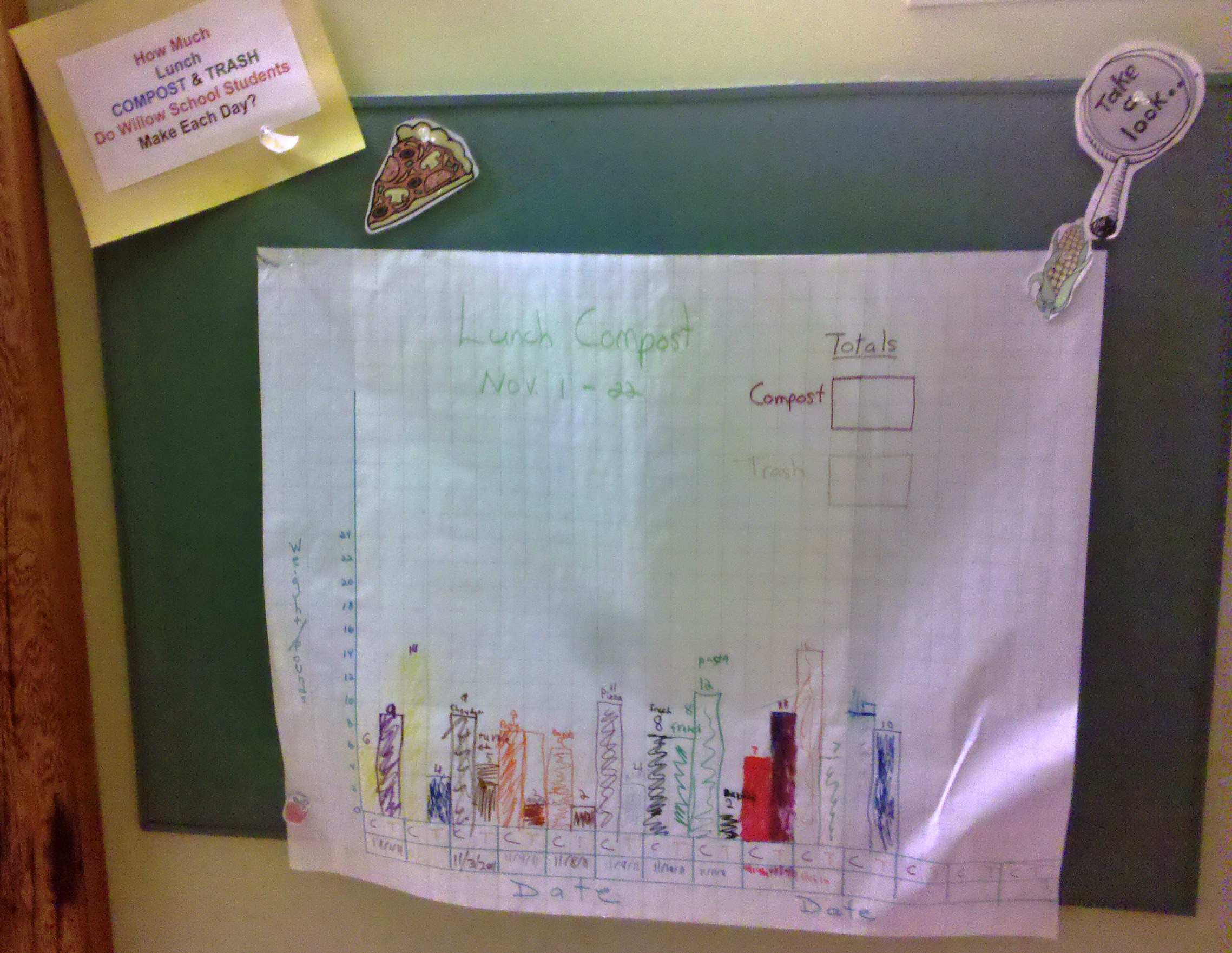 The students there weigh the trash and compost each day and are able to determine what school lunch menu results in the most waste. One group recognized that there was a lot of pizza crust in the bins so the students came up with the idea to cut crusts by pairing up crust eaters and non crust eaters so every bit was enjoyed rather than tossed.