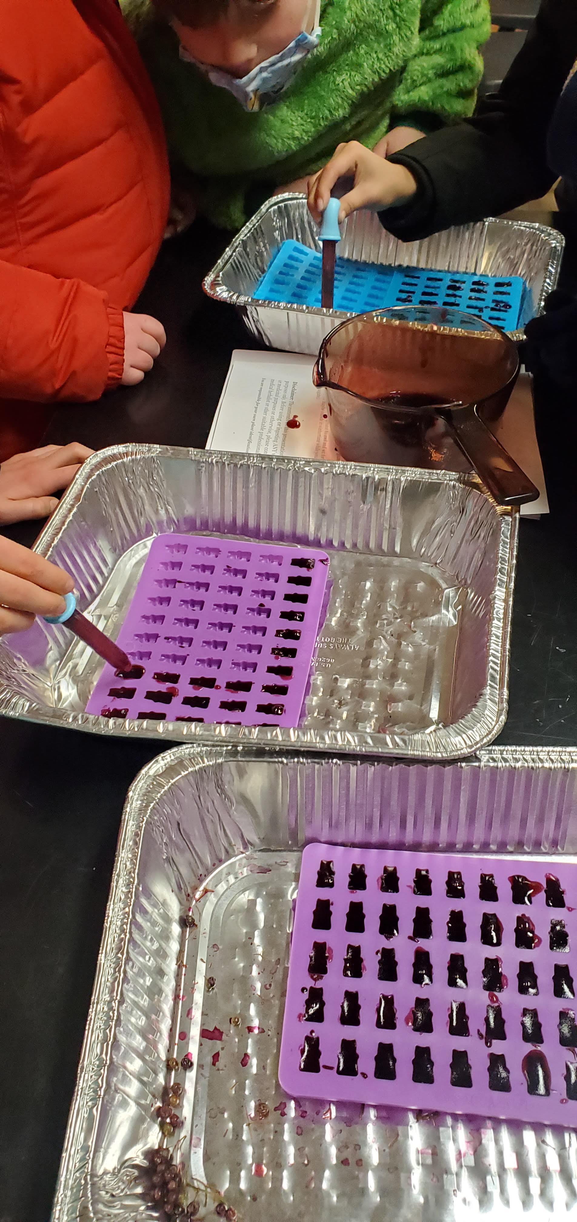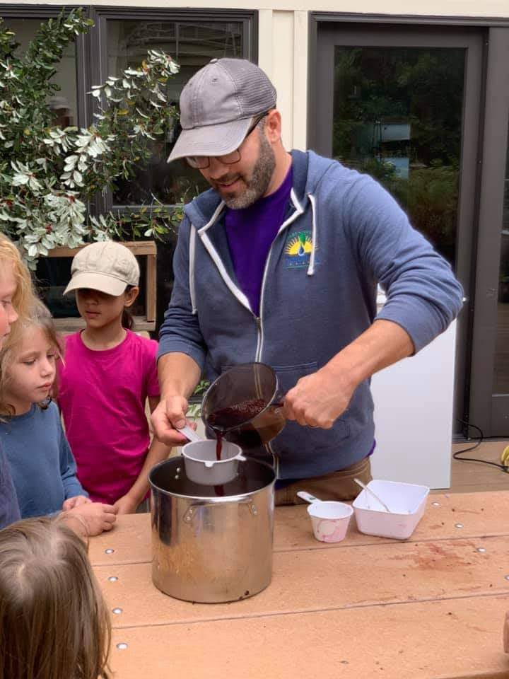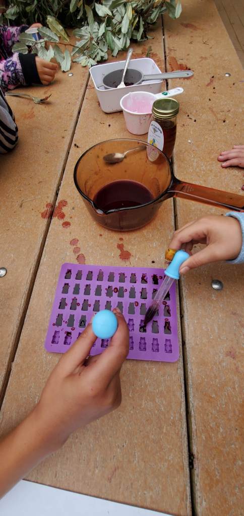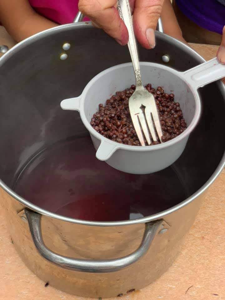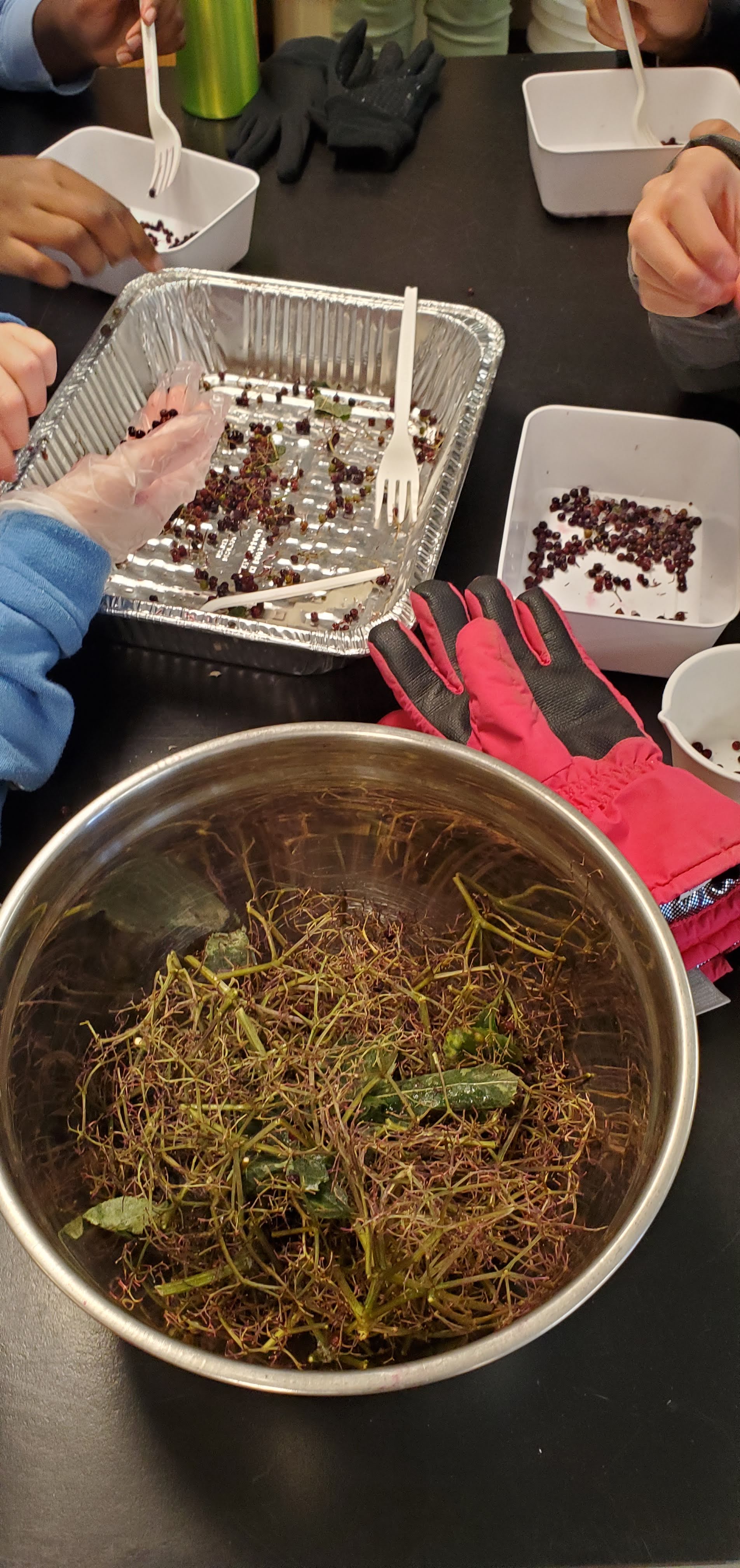 The berries are antioxidant rich, high in vitamin C and iron. At the peak of perfection the berries were cut on the stem, bagged and frozen until the moment before class. The kids used forks to carefully remove the ripe berries from the toxic stem so the berries could be cooked for consumption. Once we had our berries separated we were able to begin our syrup and gummies! The kids also enjoyed some elderberry juice (syrup and water) along with autumn olives and frozen fox grapes to learn more about the joys of autumn foraging.