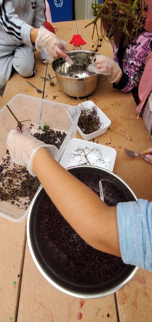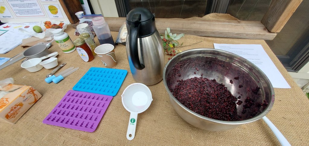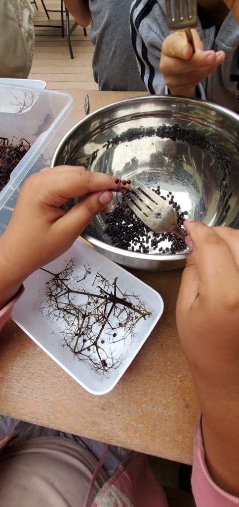 I’ve been propagating and harvesting elderberry (Sambucas canadensis) for a few years now and took the opportunity to share how I make syrup and gummies with a home school class. Anytime food is involved I know that I’ll have their attention and no doubt the visual, tactile and taste based sensory experience would be remembered for a long time.