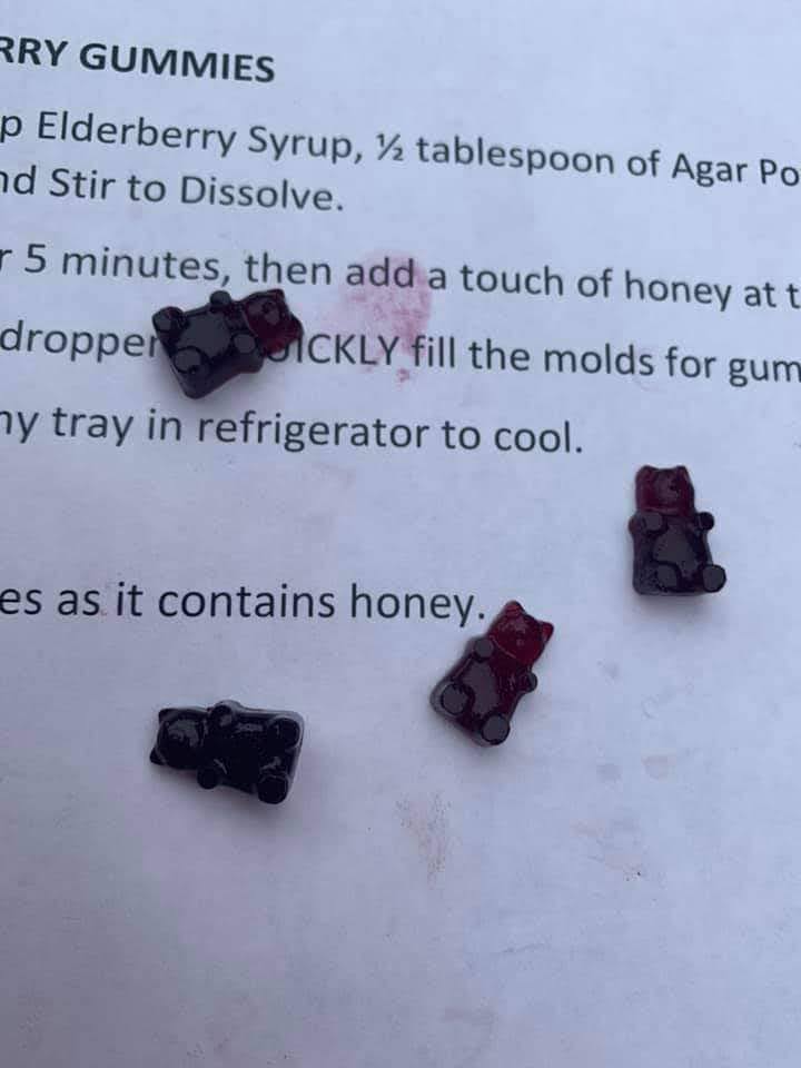 1. Take ½ cup Elderberry Syrup, 1 tablespoon of Agar Powder (Vegan) and Stir very well to dissolve. (you’ll need the tablespoon for the gummies to hold the right consistency – this is more than may be listed as the suggested use which creates a soft gelatin but not the firmer gummy we are after)