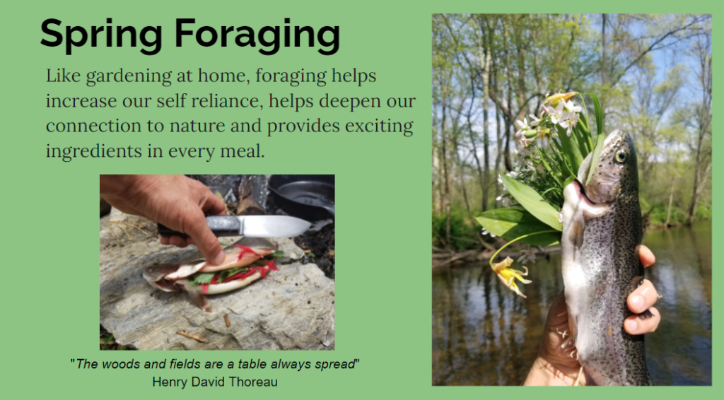 FORAGING (choose your season of focus): Like gardening at home, foraging helps increase our self reliance, helps deepen our connection to nature and provides exciting ingredients in every meal. Learn to forage local plants and mushrooms from the landscape and discuss ethical harvest and safety protocol like avoiding toxic lookalikes. Virtual or In-Person Presentation, 1hr $200 Added option to cook what we find to make a toastie along with some wild tea from the landscape – add 1hr, $100.
