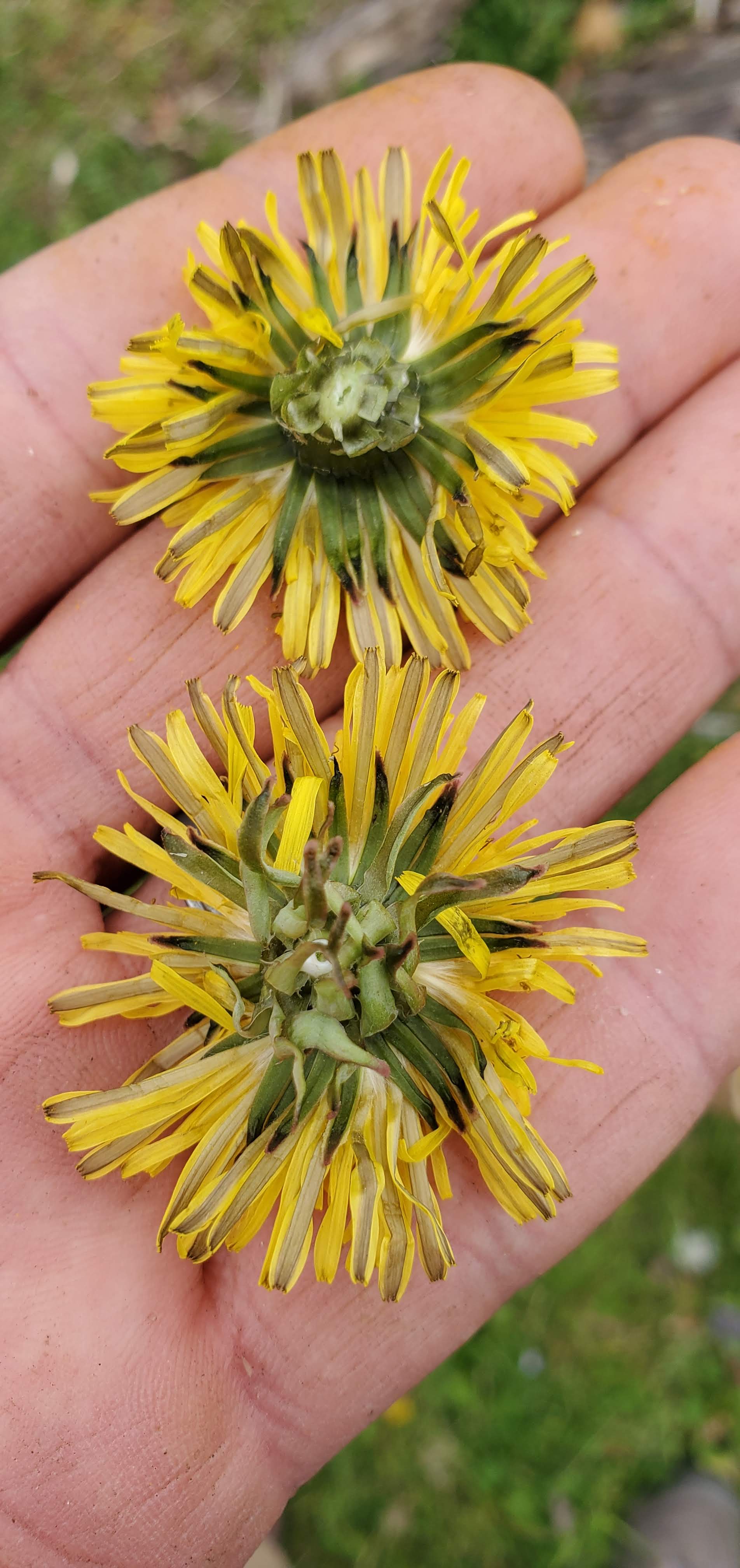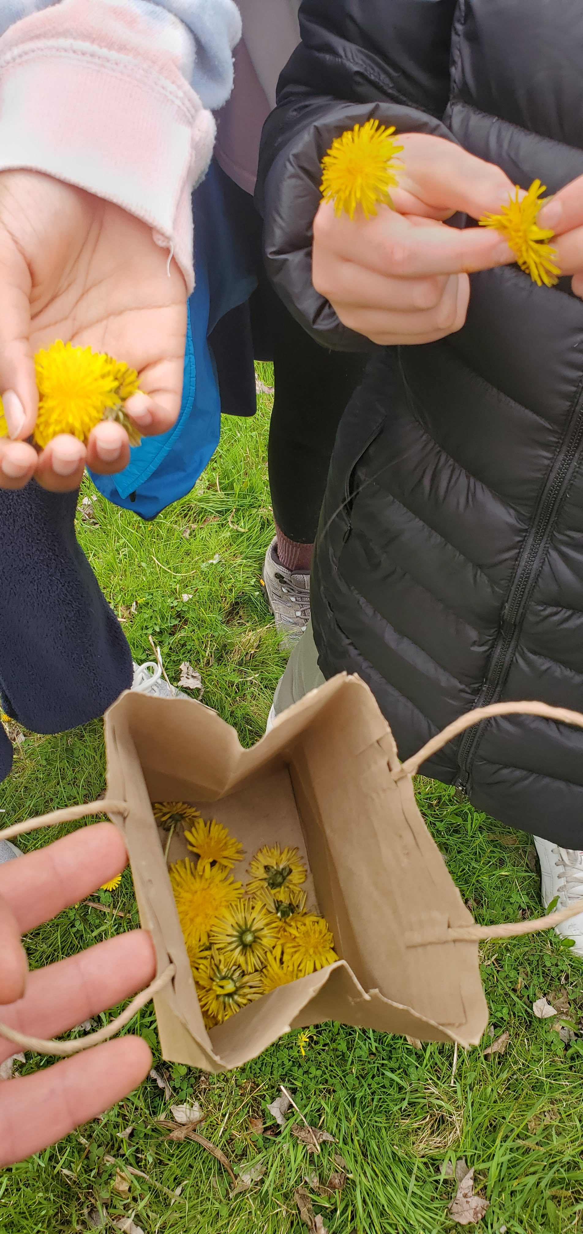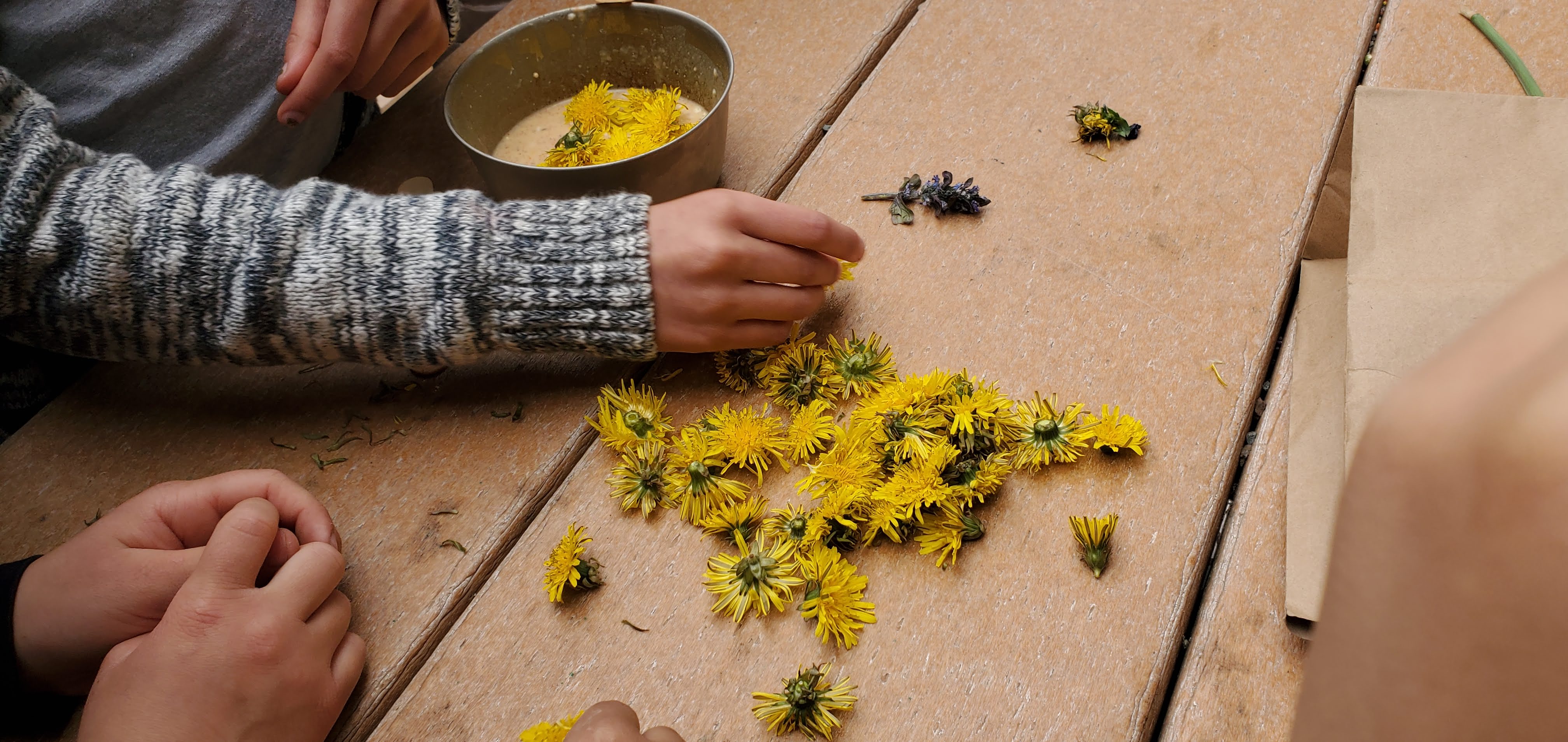 With peak dandelion bloom at the end of April we went to a field (no chemical applications) and collected the flowerheads of the dandelion. The bottom set of bracts that faces downward can be removed to reduce bitterness but the dandelions were picked at the peak of freshness so it hardly seemed necessary. Teaching about flower anatomy, taking a wildflower walk and learning about the wild edible dandelion in “bite size” pieces made for an engaging lesson that my home school classes and girl scout flower merit badge kids will hopefully remember and appreciate.