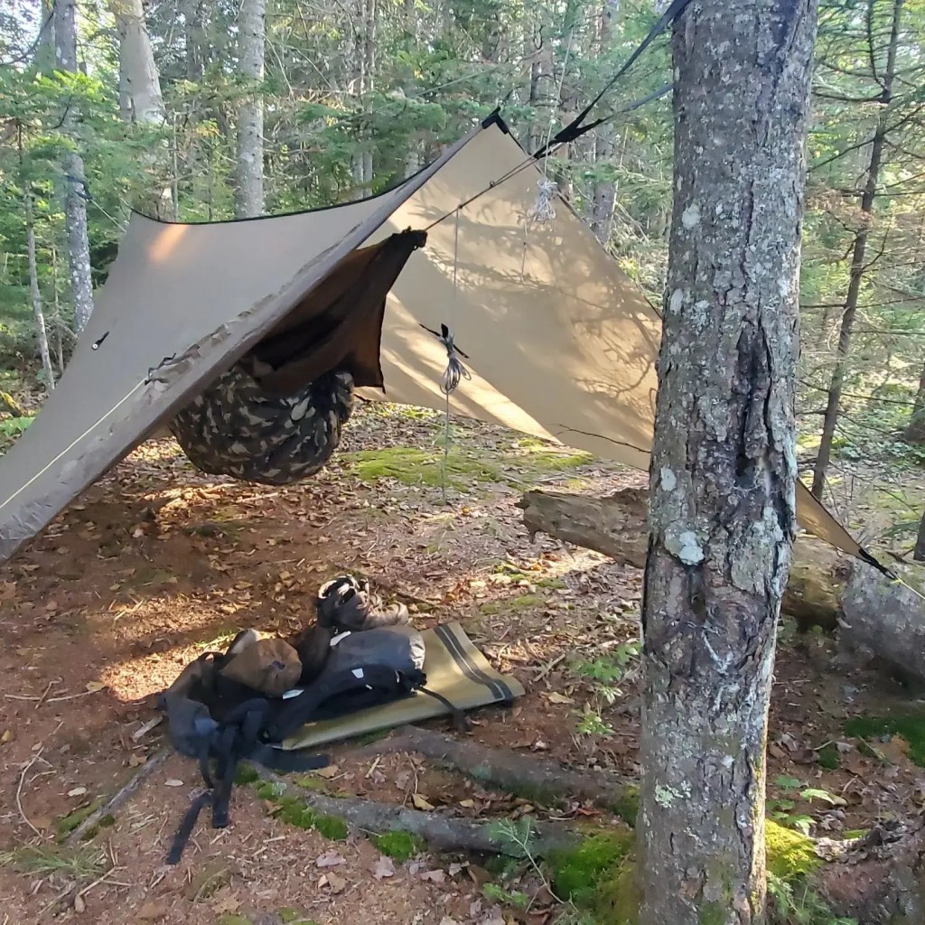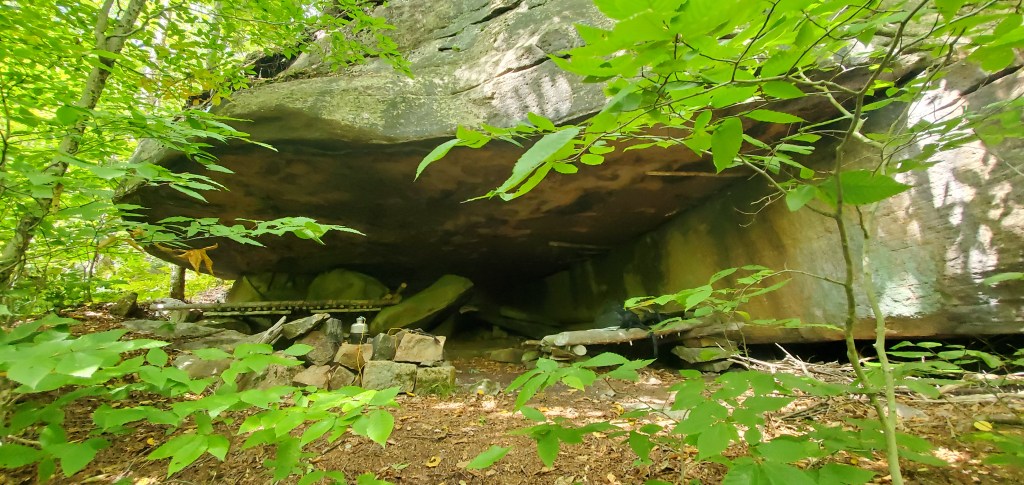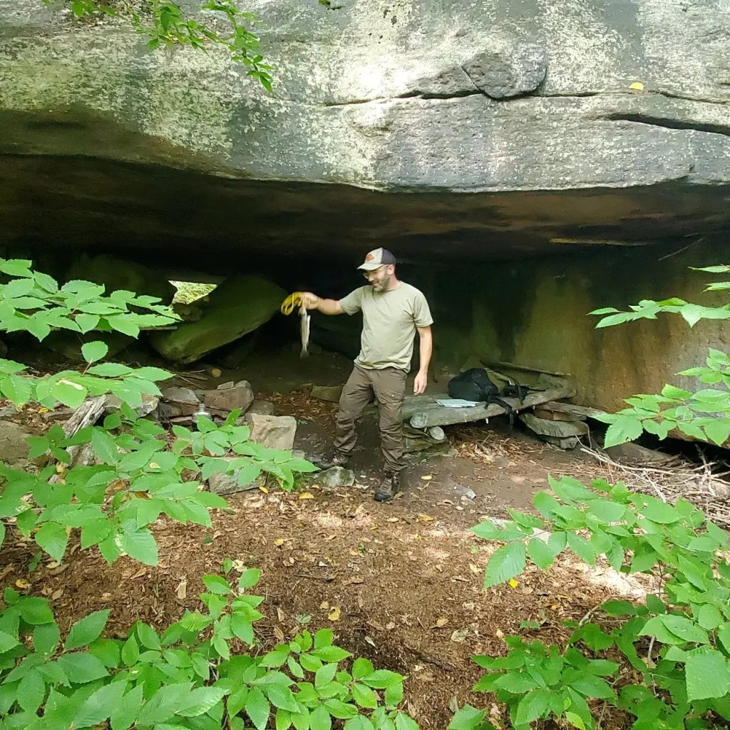 Along the way we caught brooktrout and ate a lunch at his remote cave shelter of fish and venison. We left behind some balsam browse for his bed and a two prong wood carved fork at his hearth.