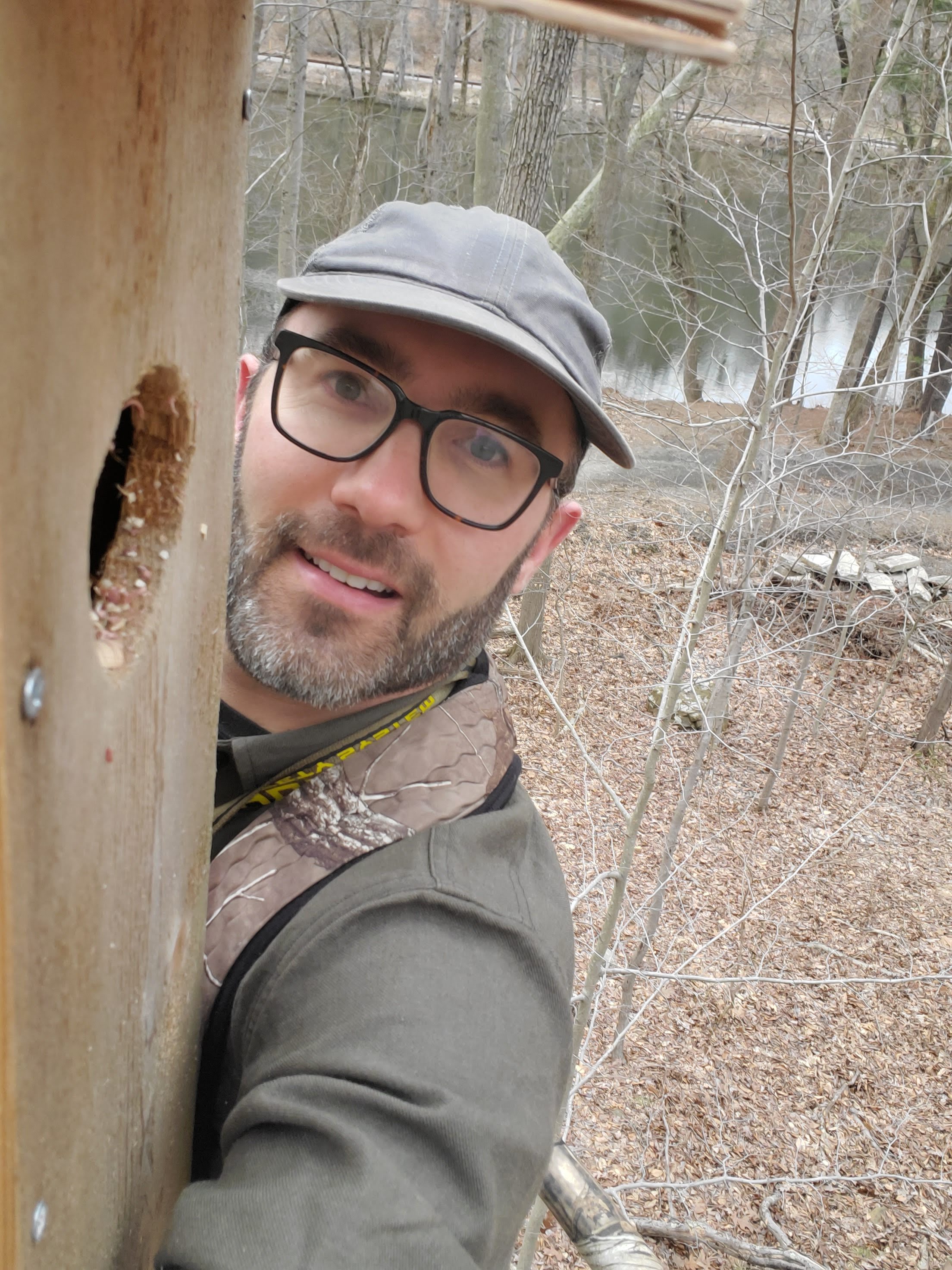 I’ve continued to work with scouts to build boxes and recently mounted a few at South Mountain Reservation within Essex County. To do so I used my tree climber for deer management and went 15+ feet up a tree and screwed the box into the tree with 1/4 in.-20 x 4 in. Zinc Plated Hex Bolts with washers or galvanized construction screws.